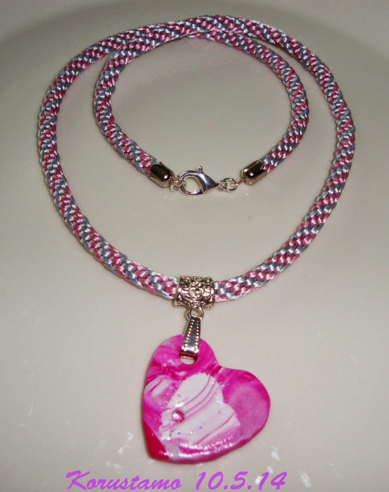Sydän roikkuu kumihimo-nauhassa, jonka tein satiininyöristä,1 mm.