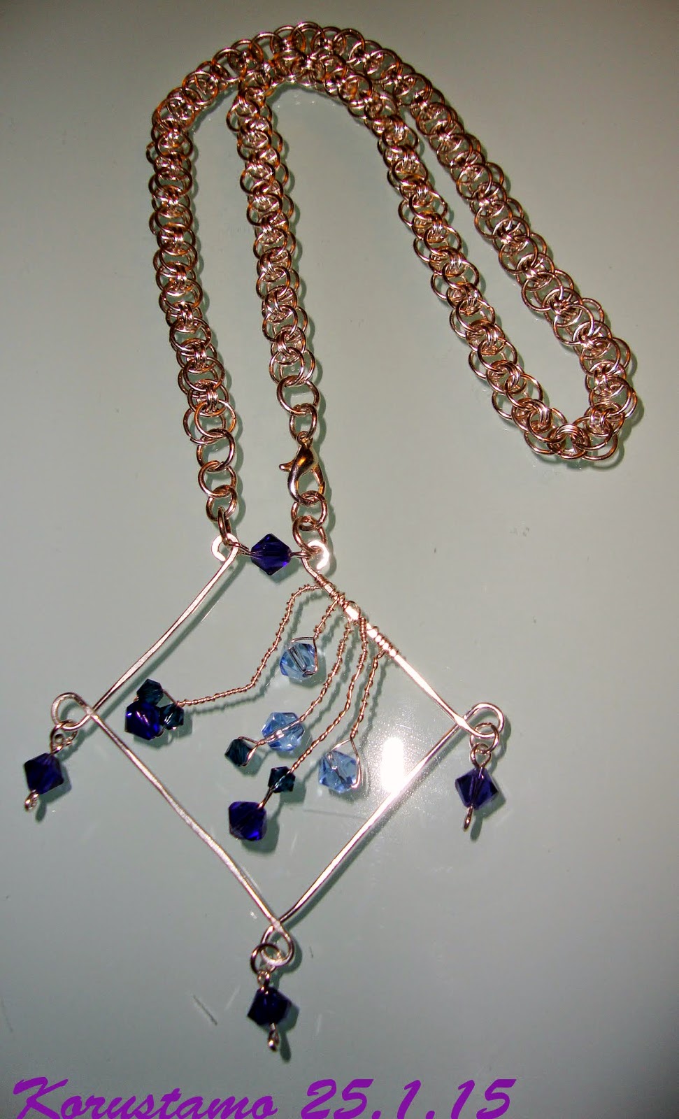 Metallirengas, virkkauslankaa, höyheniä, nahkanauhaa, metallilankaa, ametistisiruja, lasibiconeja, kristalleja ja opaalisiruja.